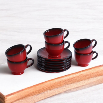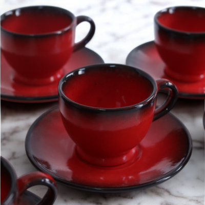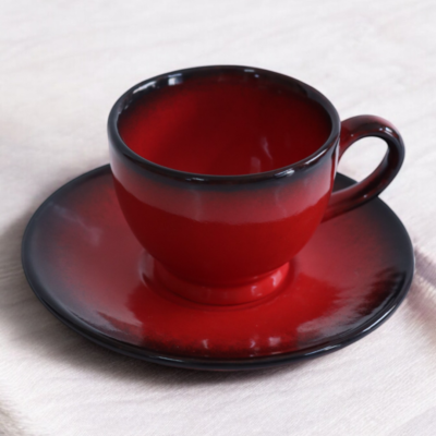 Make a bold statement with our Red Velvet Tea Set. Each cup and saucer is meticulously handcrafted, showcasing a vibrant fiery red glaze that exudes elegance. The sleek design and comfortable grip make it the perfect choice for your daily coffee ritual. Elevate your morning routine with this luxurious and sustainable ceramic set.